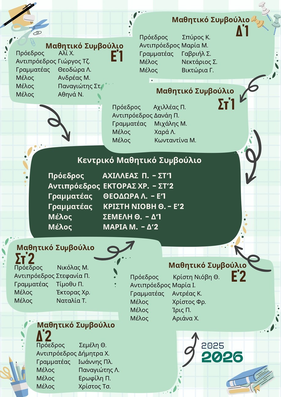 Τα μαθητικά συμβούλια εκπροσωπούν τις τάξεις και προωθούν τις ιδέες και τις ανάγκες των μαθητών/τριών. Συμβάλλουν στη συνεργασία, στη θετική σχολική ζωή και στην ενεργή συμμετοχή όλων.